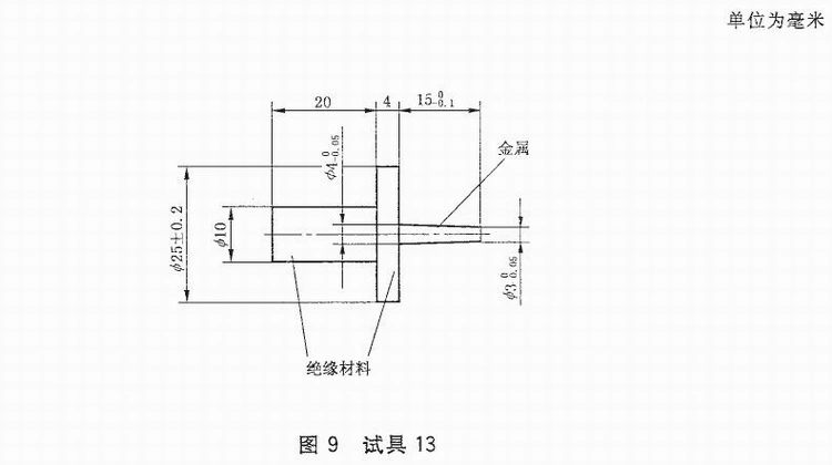 1、探棒直径:头部3 mm,尾部4 mm 2、探棒长度:15 mm 3、挡板直径:25 mm 4、挡板厚度:4 mm 5、参考标准:IEC61032:1997 图9