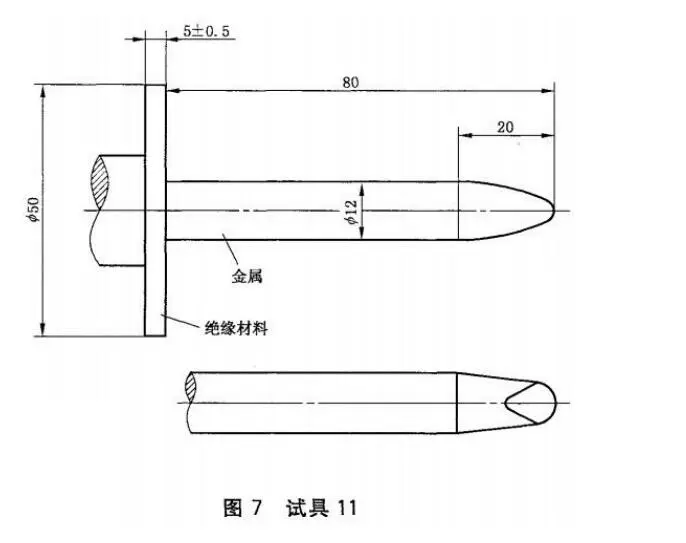 1、手指直径:12 mm 2、手指长度:80 mm 3、挡板直径:50 mm 4、挡板厚度:5 mm 5、参考标准:IEC61032:1997 图7